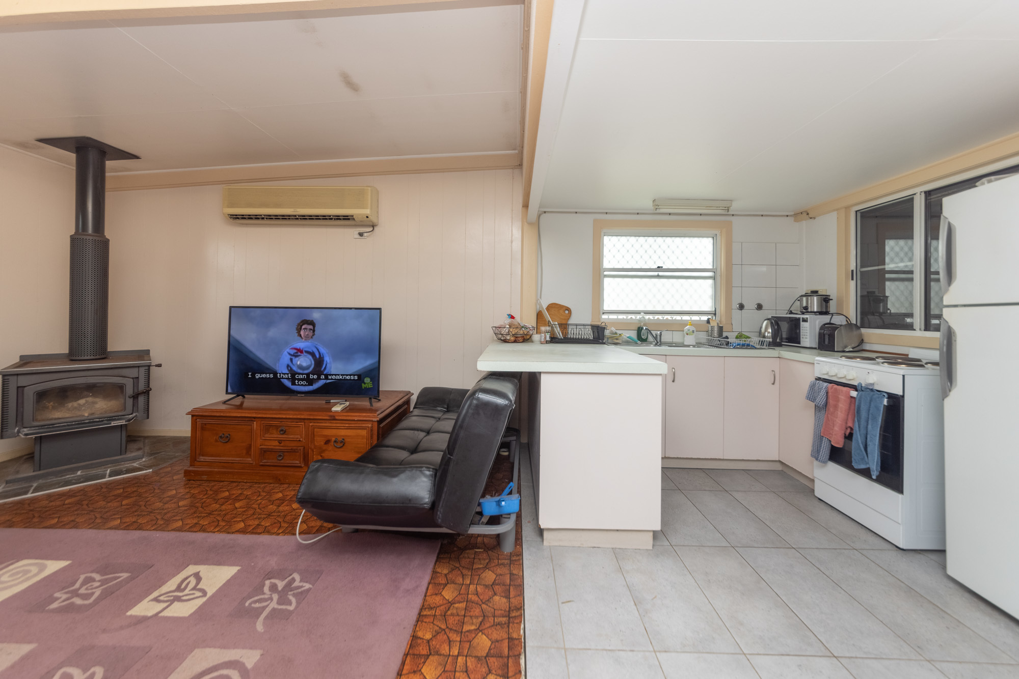 Downstairs there is a large open living space, kitchenette, bathroom, laundry and wood fire heater plus a bathroom and storage.